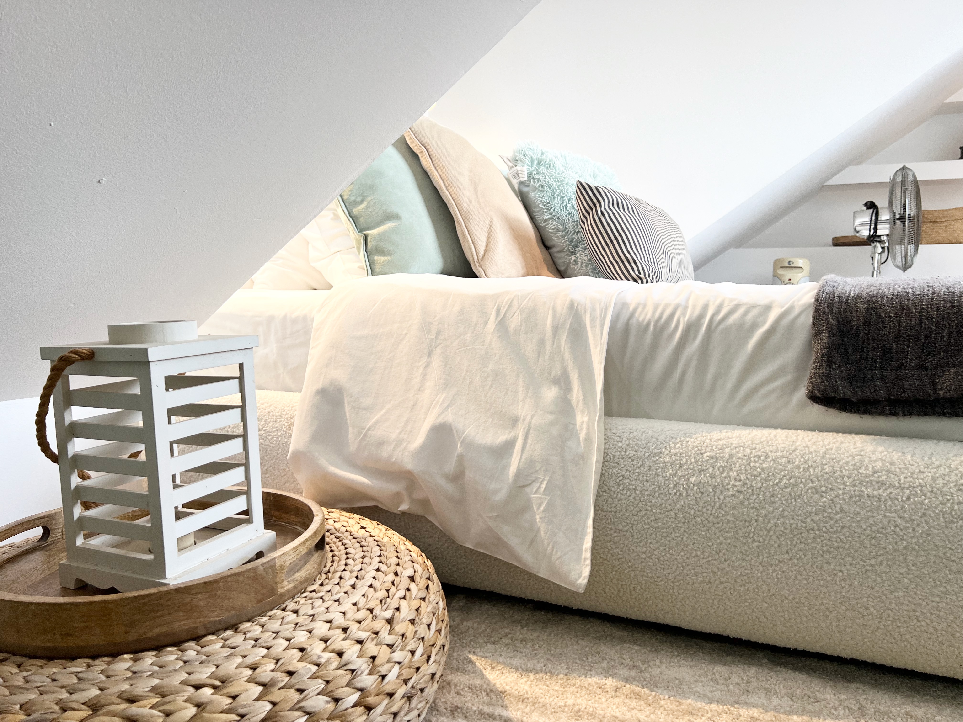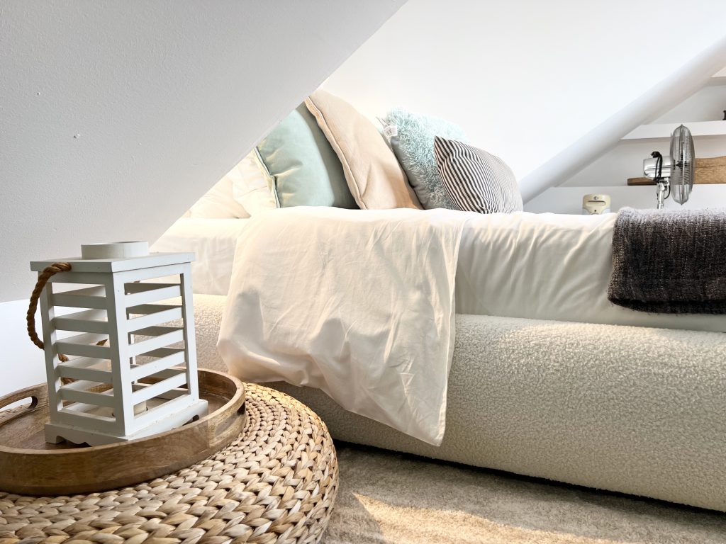 Ein elegantes Duschbad mit Regendusche lädt zum Entspannen ein. Über eine offene Treppe gelangen Sie in das Dachgeschoss. Hier befindet sich ein gemütliches Schlafzimmer mit einem Queensize-Boxspring-Bett.